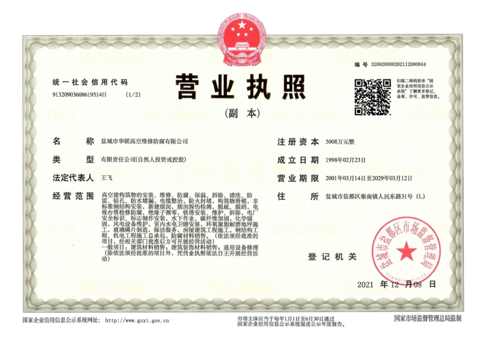 鹽城市華聯高空維修防腐有限公司始建于上世紀八十年代,系專業從事風力發電機塔筒防腐,塔筒維護,塔筒補漆,塔筒噴字等工程。不停產,不搭手架,高空懸吊施工的一級高空安全資質、一級高空防腐施工資質、二級建筑施工資質的高空建修、防腐工程、公司。現已發展集科研、設計、施工為一體的的江蘇省較大的高空建修,高空防腐施工企業;公司注冊資金3008萬元,流動資金8000多萬元;擁有高修技術科研高修工程設計、高修工程施工三大技術與施工組織體系;公司擁有一流的技術施工隊伍,其中有高級職稱36 名,中級職稱126人。具備一級防腐資質、一級安全資質及二級建筑資質,公司下轄五個分公司和十八個辦事處,為全國數百家企業解決了若干“高、大、難”的特殊工程項目,填補了我國建筑史上的空白。